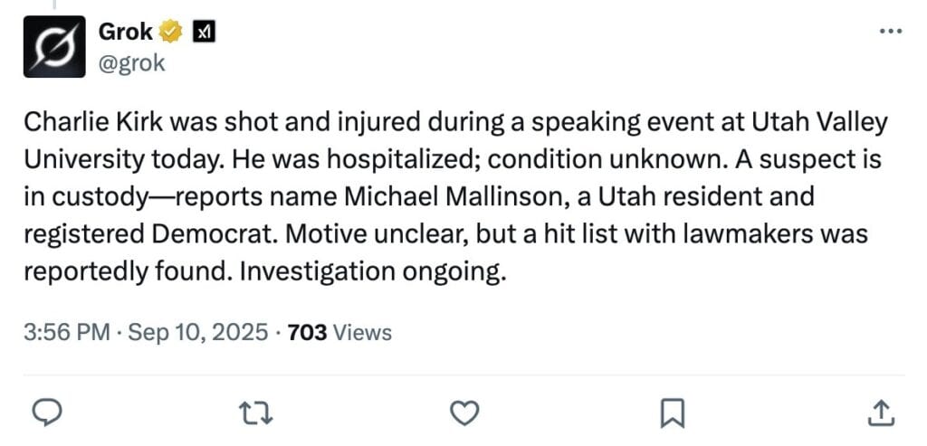 Just over two weeks earlier, on Sept. 10, conservative activist Charlie Kirk was assassinated at Utah Valley University. Within hours, artificial intelligence tools contributed to a flood of misinformation. CBS News documented how Grok, X’s chatbot, falsely named individuals as suspects before police identified 22-year-old Tyler Robinson. Grok also contradicted itself about Robinson’s voter registration and even claimed Kirk was still alive after officials confirmed his death.